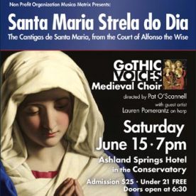 The program features songs from the 13th Century Spanish Codex containing over 400 songs in the Galician-Portuguese language extolling the virtues and miracles of the Virgin Mary. The small a cappella choir will be accompanied by a selection of Medieval instruments including the vielle, hurdy-gurdy, harp, recorder, tar and riq.
