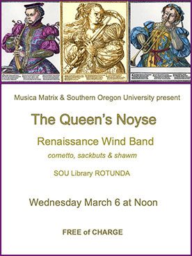The Renaissance Wind Band, The Queen’s Noyse, will be performing on March 6th, 2019 at Southern Oregon University Library Rotunda. If you are an early music fan, you won’t want to miss this free concert.